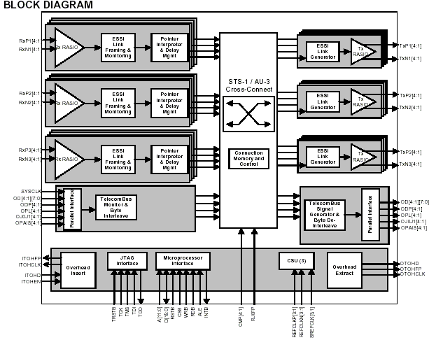 Features: • High performance backplane interface and cross-connect for 2.5G line cards in SONET/SDH systems.• Provides one low-speed parallel TelecomBus interface operating at 32 bits x 77.76 MHz.• Provides three high-speed multi-rate serial backplane interfaces.• Supports ...