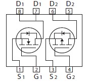 PinoutSpecifications Parameter Symbol N-Channel P-Channel Unit Drain-S ource Voltage VDS 30 30 V Gate-S ource Voltage VGS ±20 ±20 V Drain Current-Continuousa @ Tj=125-Pulsedb ID 7 -4.5 A IDM 29 -18 A Drain-S ource Diode Forward Currenta IS 1.7 -1.7 A...