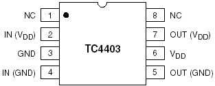 TC4403: Features: • Low Quiescent Current: 300µA Max• Capacitive Inputs With 300mV Hysteresis• Both Inputs Must Be Driven to Drive Load• Low Output Leakage• High Peak Cur...