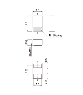 PinoutSpecifications Absolute maximum ratingsVRWM min *max [V]from pin1 to 25.3*V(BR) min [V]I(BR)=1mA, pin1 to 26IR max [nA]VR=5.3V, from pin1 to 2100VCL typ [V]Ipp=1A, Tp=8/20µs, from pin1 to 210CT max [pF]VR=0V, f=1MHz0.6ESD DischargeIEC61000-4-2 contact20
